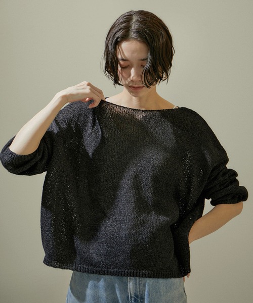 清涼感のある肌離れの良い和紙素材を使用した長い期間活躍するサマーニット■デザイン/シルエット 素材の良さを活かしたシンプルなクロップド丈のプルオーバー。 広めの天幅で抜け感と女性らしさを演出します。 緩めなシルエットで身体のラインを拾わないので嬉しい体型カバー効果も。 バックにはSALONオリジナルのチャーム付きできらりと光るゴールドプレートがワンポイントに。 肌離れもいいので暑い時期も快適に過ごせるサマーニットです。 定番のブラック、ホワイトと華やかなブルーの3色展開です。 ■素材 和紙を極めて細くし糸に撚りこむことで、通気性、吸水速乾、軽さ、 家庭でのイージーケアも兼ね備えた夏に最適なニットを使用。 清涼感を特に高めるため、糸を凹凸感のあるカベ調に仕上げています。 ミドルゲージながらも型崩れしにくいのも和紙の特徴。ニット特融のサイズ変化を軽減します。 ■コーディネート パンツ、スカートどちらとも相性◎ キャミワンピースなどリーンなシルエットのアイテムの上からレイヤードしても素敵です。 シンプルなデザインなのでプリントボトムと合わせてもオススメです。 ■同素材のリラックスカーディガンもございます。 商品番号:SHK34190 商品名:ペーパーヤーンリラックスカーディガン【吸水速乾・洗える】 ■モデル身長:166cm 着用サイズ:F(ショートヘアモデル) ■モデル身長:172cm 着用サイズ:F(ロングヘアモデル) ----------------------------- 裏地:なし 光沢感:なし 透け感:ややあり 伸縮性:あり 生地の厚さ:やや厚手 -----------------------------