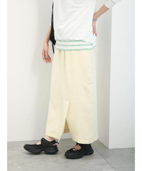 ストライプ模様のふんわりとしたふくれジャカードで仕立てたスカート。 タイトなナローシルエットで、着こなしもスマートな印象に。裾スリットもさりげなくヌケ感をプラスしてくれます。 ウエストゴム仕様で安心感のある穿き心地◎ シンプルなデザインで着回しもしやすく、デイリーユースにも活躍してくれるアイテムです。 ※商品画像は、撮影環境やお客様のご利用のPC・スマートフォンのモニター環境などにより実物と色味に差異がある場合がございます。 【その他採寸】 F ウエスト:[ゴム仕様]64cm
