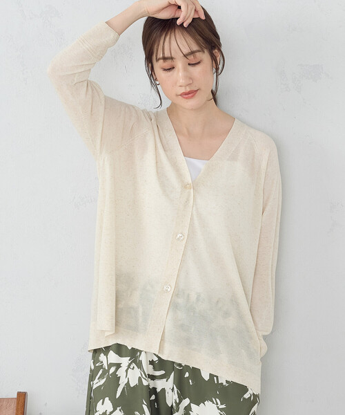 《デザイン》 リラックス感のあるシルエットが特徴の ボクシーなVネックカーディガン。 ベーシックなデザインながら、 サイドのスリットと裾にボタンを付けないことで軽い印象にしています。 艶のあるボタンと、袖口のリブ上に タック編みを入れてデザインアクセントに。 サイドスリット入りで自然な広がりがあり、 パンツはもちろん、ロングスカートにもバランス良く合わせられます。 同素材のリネン混プルオーバー(品番:12-76KG08-204)と アンサンブルで着て頂けます。 《素材》 ハイゲージの麻混素材。 麻らしいドライなタッチにするために擬麻加工を施し、 夏らしい清涼感ある肌触りと ソフトな風合いのさらりとした着心地の良い素材に仕上げました。 擬麻加工とは・・・ 麻のようなドライな感触、光沢、清涼感を得るために施す加工のこと。 …………………… 透け感:ややあり 厚さ:薄手 伸縮性:あり 光沢感:なし 洗濯方法:手洗い …………………… ※画像の商品はサンプルとなりますので実際の商品と仕様、加工、サイズが若干異なる場合がございます。 ※こちらの商品はFIVE FOXes独自の採寸方法となっています。 本サイトのサイズガイドと採寸方法が異なる場合がありますのでご了承ください。