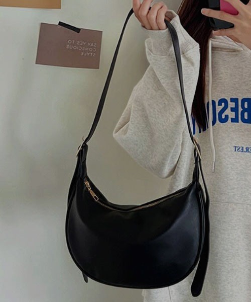 \韓国っぽが叶う/シンプルなハーフムーンショルダーバッグ小さめですが500mlのペットボトルも入る収納力◎内側にはファスナー付きのポケットと、オープンポケットがついているのでイヤホンやカギなども散らばりにくく取り出しやすいです♪デイリーはもちろん、旅行にもおすすめのアイテムです♡【仕様】■マチ/ 有(約8cm)■内側ポケット/ 有【サイズ】■本体 /縦:約17.5cm × 横:約29cm※平置き採寸しております。 商品により、若干サイズが異なる場合がございます。 ご了承くださいますようお願いいたします。※ATTENTION※■撮影の光量などにより画像と実物の色味が異なって見える場合がございます。■時期により商品の色味が画像と若干異なる場合がございます。 あらかじめご了承ください。”アイテムと自分と共振した時に、個性が輝やく”テーマのresonance。デザイン、ジャンルにとらわれない品のあるアイテムをセレクト。