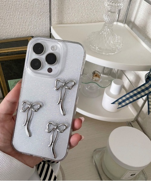 【 BARELY BLUE / ベアリーブルー 】 クリア ラメ シルバー リボン iPhoneケース / 11 , 12 , 12pro , 13 , 13pro , 14 , 14pro , 15 , 15pro , 16 , 16pro 対応