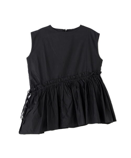 B omnivore/ビーオムニボー コットン&タフタS/Lプルオーバーほんのりとしたツヤ感、洗い晒したようなシボ感のあるタフタを使用した斜め切り替えノースリーブプルオーバー。たっぷりギャザーのフリルに、エッジを効かせたラフな素材感と斜め切り替えのディティールがポイントです。【B omnivore/ビーオムニボー】omnivore=雑食系統に捉われず、様々なファッションスタイルとミックスして頂ける洋服を提案。