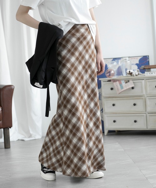 レトロなチェック柄のマーメイドラインのスカートの登場です! ヒップラインがキレイに見え、裾のフレア感が女性らしいです。 マーメイドラインはエレガントな印象ですが、チェック柄なのでカジュアルなトップスとも相性抜群です。 タイトめなトップスを合わせるとボディーラインがよりキレイに見えオススメ! パンプスなどと合わせるとキレイめにまとまりますが、スニーカーなどと合わせてあえてカジュアルダウンさせても普段使いしやすいです。