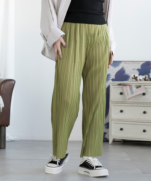 プリーツ加工のされたイージーパンツです! ゆったりとしたサイズ感で、ウエストがゴムなのでとにかく履きやすい◎ プリーツで縦に線が入っているので脚長効果があり、スッキリとしたシルエットで様々な体型の方に合います。 シワなども付きにくいので扱いやすく、旅行などにもオススメです! ブラウスやパンプスと合わせてキレイめスタイルでまとめても、Tシャツやスニーカーなどのカジュアルなアイテムと合わせてもかわいいので着回しが効きます!