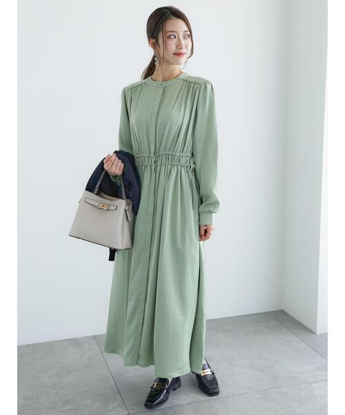 ウエストに施されたドローストリングでシルエットの変化を楽しめるワンピース。 さらりとした生地を使用することで、上品な雰囲気の着こなしを演出します。 シンプルなバンドカラーのデザインが首元をすっきりさせるのもポイント◎ 1枚でクラシカルな装いを実現できるアイテムです。 ※商品画像は、撮影環境やお客様のご利用のPC・スマートフォンのモニター環境などにより実物と色味に差異がある場合がございます。 【その他採寸】 F ウエスト:[ゴム仕様]76cm