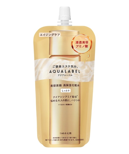 もちっとハリつや溢れる肌へ 美容液級高保湿化粧水 ナイアシンアミド(うるおい保護成分)配合。悩める大人の肌に、ハリつや。キメの奥までじゅわ~っと浸透(角層まで)。もちっとハリつや溢れる肌へ、美容液級 高保湿エイジングケア*化粧水。 乾燥小ジワを目立たなくする(効能評価試験済み)。 *年齢を重ねた肌にうるおいを与えるケア 【内容量】150mL <化粧水> 【使用方法】 ●必ず、アクアレーベル トリートメントローション (オイルイン) しっとりの本体容器につめかえてから、ご使用ください。 ●洗顔の後、手のひらに適量をとり、顔全体になじませます。 <本体容器へのつめかえ方> (1)本体容器のキャップは下の部分を持ち、まわしてはずしておく。 (2)そそぎ口の付け根部分をしっかりおさえながらキャップをはずす。 (3)そそぎ口を本体容器に差し込み、そのままゆっくり中味を入れる。 (4)本体容器にキャップを差し込んで、しっかり閉める。 ◇商品に記載されている注意表示をよく読んでからお使いください。 【ご購入前に】 ※ご使用のパソコン、スマートフォンのモニター環境により、カラーが実物と若干異なる場合がありますので、ご了承ください。 ※商品パッケージが予告なく変更となり、商品画像と異なる場合があります。 ※成分表記は、商品の改良や表示方法などの変更により、実際の成分と一部異なる場合があります。実際の成分は商品の表示をご覧ください。 ※原産国は予告なく変更になる場合があります。実際の原産国は商品の表示をご覧ください。