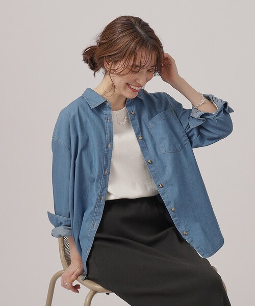 【デザイン】 程よくゆとりのあるサイズ感がこなれた印象のデニムシャツ。 腰回りをナチュラルにカバーできる長めの丈感と ラウンドヘムのデザインがカジュアルに着こなしていただけます。 オールシーズン活躍する一枚です。 ※ポケット数:胸元×1 【スタイリング】 一枚ではもちろん、上からベストやスウェットを重ねたレイヤードスタイルや、 ボタンを閉めてパンツ合わせや、前を開けて羽織など幅広い着こなしをお楽しみいただけます。 いつものシンプルコーデに肩掛けや腰に巻いてアクセントにプラスするのもおすすめです。 【素材】 肌さわりが良く、コットンデニムのラフさがあります。 柔らかくレイヤードもしやすい素材感です。 モデル情報:身長166cm B80 W59 H85 着用サイズ:02(M) 店舗へのお問い合わせ商品番号:C62-88004 ●製品寸法: 02(M):着丈68cm B108cm 袖丈49cm 肩幅52cm 03(L):着丈69cm B111cm 袖丈50cm 肩幅53cm 04(LL):着丈70cm B114cm 袖丈51cm 肩幅54cm 備考: