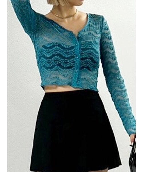 トレンド素材のレースを使用した、クロップドトップスです。レースの柄がガーリーになりすぎないように、ウェーブがかった模様を使用しております。透け感のあるトップスなので、インナーキャミ合わせだったり、羽織としてのスタイリングがオススメです。