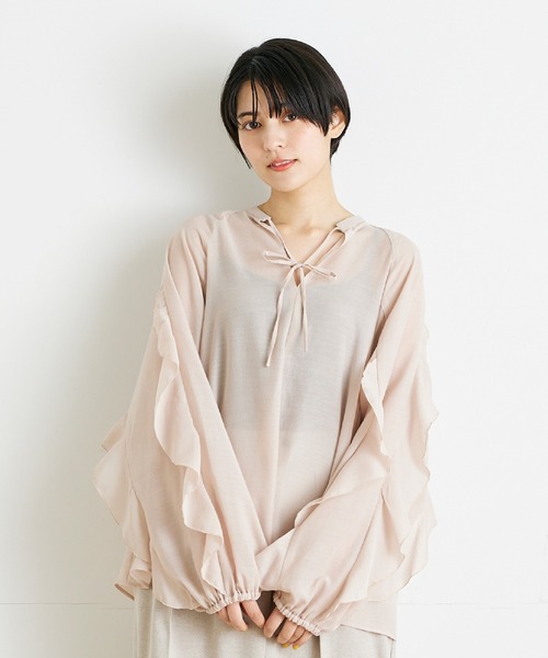 大胆なフリルがモード可愛いブラウス。肩から袖口まで入ったダイナミックなフリルが1枚で着映えするデザイン。首回りはスッキリしたVネックで大人可愛い雰囲気に。紐は結んでも、垂らしてこなれ感のある着こなしにしても◎ゆとりのあるサイズ感なので、細めのパンツに合わせた大人カジュアルなスタイリングがおすすめです。・水洗い可■サンプル撮影商品■こちらの商品はサンプルでの撮影となっております。実際の商品とは、サイズや色味、素材、デザイン等の仕様が若干変更になる場合がございます。