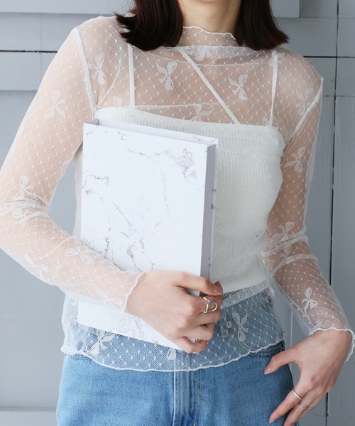 《 リボンモチーフ*⑅୨୧ 春のレイヤードコーデのメインアイテム 》■デザイン・1枚あると便利なシアートップスに可愛いリボン柄が登場です。・ドット×リボン柄でとことんガーリーに仕上げました!・透け感のあるシアー素材でレイヤードコーデにぴったりです。■素材さらっとしたポリエステル素材■スタイリングカーディガンや、半袖のニットの中にレイヤードするのがおすすめです!袖や首回りからチラッと見せるだけでも存在感のあるレースインナーです。------------------------------生地感:薄手伸縮性:ある透け感:ある裏地:なし------------------------------------------------------------【スタッフが着用しました!】身長:153cm普段着用サイズ:S~Mサイズ今回着用サイズ:FREEサイズ・着用感首元、手首だけを見せてあげるように深めのVネックデザインのトップスなどにレイヤードしてあげると大人カワイイスタイルになります♡半袖ニットやカーディガンとのレイヤードでは春モードのスタイルに♪アクセサリー感覚で楽しめて、一枚で上級者見えするトップスですね♪------------------------------------------------身長:164cm普段着用サイズ:M~Lサイズ今回着用サイズ:FREEサイズ・着用感甘辛コーデを楽しめるトップス♡とことん甘くはもちろん、気軽に着こなしたいときはレイヤードがおすすめ♪ジャケットやニットの重ね着でお洒落に着こなせます♪デニムやカジュアルなものと合わせて着用すると、ほどよい肌見せがセクシー×ヘルシーな印象になるアイテムです◎------------------------------------------------
