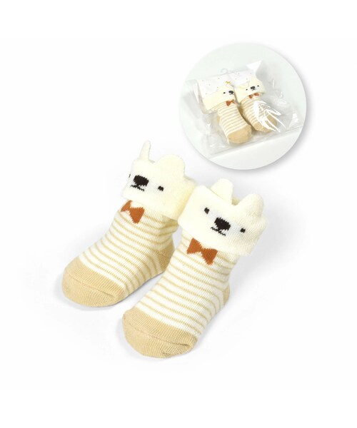 履き口から、ピョコンと飛び出た動物さんのお耳や恐竜さんのヒレがキュートなソックス。 男の子にも女の子にもお気に入りを見つけてほしいから、モチーフはカラーごとに異なる3色をご用意しました。 オフホワイト:ボーダー柄にリボンタイでおめかししたクマさん ピンク:ドット柄にお鼻がハートのウサギさん グリーン:恐竜がたくさんいる柄にちょこっと見えるキバが可愛い恐竜さん 赤ちゃんの足をやさしく包み込むソックスは、お散歩などのお出かけ時はもちろん、室内でも活躍します。 付属品がないので、普段使いにぴったり! 靴下裏底には、滑り止めつきで、たくさん動き回るベビーにも安心です◎ ソックスは贈り物のプラスワンやプチギフトとしてもオススメなアイテムになっています。 同じモチーフを使用したスタイ(1834-61058)やガラガラ(1834-61069)、おくるみ(1834-61047)を展開しているので合わせてギフトにオススメです。 2024年春夏男の子・女の子アイテム。 【SLAP SLIP(スラップ スリップ)】 ~子どもの欲しいをカタチに~ ヨーロッパのこどものように 子どもらしい今しか着れないナチュラルなかわいさを提案 どこか上品で清楚感漂うフレンチカジュアルは いつものコーディネートをさりげなく格上げ
