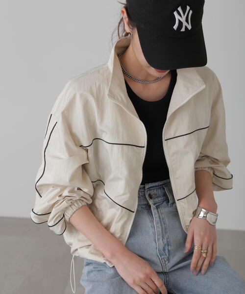 〔fabric&design〕ワッシャー感のあるナイロン生地にパイピングの配色ラインを施したナイロントラックジャケット。裾のドロストコードでシルエットや丈の調整が可能。袖口はゴム仕立てなのでたくし上げやすい仕様になっています。〔styling〕シックな配色な為着こなしやすいカラーリング。オフはサイドラインドロストパンツとセットアップで着れます。カットティアードナロースカートなど甘めスカートをスポーツMIXして着こなすのが今年らしい。■透け感:なし■生地の厚さ:普通■裏地:なし■伸縮性:なし■光沢:なし■シルエット:スタンダードmodel:骨格ウェーブ---------------------------------------------------◆商品のお気に入り登録◆お気に入りアイテムの値下げ・再入荷・在庫1点などの通知を受け取ることができます。◆ブランドのお気に入り登録◆新商品や再入荷、セール、クーポン配布などお得な情報を受け取ることができます。---------------------------------------------------※ご注文いただいた予約商品のお届け時期の確認は、注文履歴ページより行えます。