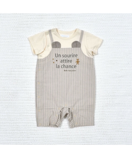 オーコットの白いTシャツに、コードットオーガ二クス40sクラフトストライプ生地のオーバーオールを重ね着した風の男の子用カバーオールです。 胸当て部分はクマの耳、胸にはルダクティオンのクマモチーフのルウちゃんとメッセージの刺しゅうが入った可愛いデザインです。 オーコットは洗いざらしのようなナチュラルな風合いと清涼感、肌にやさしいタッチが特徴です。 コードットオーガニクス40sクラフトストライプは、やや薄手の先染めブロードにクラフトワッシャー加工が施されています。 クラフト感と手作り感がある、通常のコットンより肌触りが柔らかい生地感です。 右肩から裾まで横が全開し、股下も含めて前が大きく開くので着せ替えも楽々です。 お色はストライプが映える落ち着いたベージュです。 左脇に付いたポケットもデザインポイント。 同じシリーズのオーガニックのスタイ(1754-62117)と合わせてご自宅用だけでなくギフトにもおすすめです。 ※柄の出方は生地の裁断により一点一点異なります。 ※オーガニックは第三者機関認証済です。 【fillot de bebe reduction (フィヨ・デュ・ベベ・ルダクティオン)】 ヨーロッパのベビーを意識し、上品で洗練されたシンプルさを大切に新生児服としての機能性、トレンドも採り入れたスタイルを提案します。