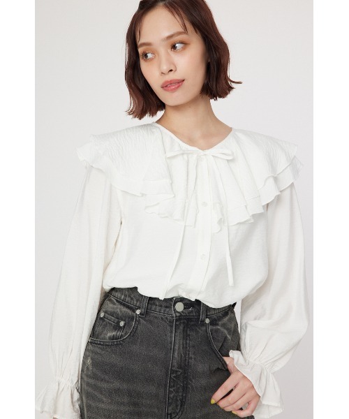 華やかなラッフルの二重衿がついたキャンディスリーブのブラウス。凹凸感のある微光沢生地を使用しています。フロントのリボンは垂らしても可愛く、袖は少し巻くってボリュームを出すのがおすすめ。▼商品のお気に入り登録お気に入りアイテムの値下げ・再入荷・在庫1点などの通知を受け取ることができます。▼ブランドのお気に入り登録新作アイテムの入荷や人気アイテムの再入荷、タイムセールやクーポンなど、いち早くブランドのお得な情報を受け取ることができます。SPRING & SUMMER ( 春服 / 夏服 )