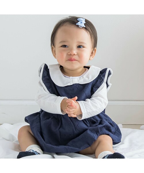 フロントを帯でしぼったリボンのようなシルエットの襟がかわいいワンピースとブルマのセットアップ。 フリル袖の配色のパイピングがアクセントに◎ 丸みのあるふんわりバルーンのスカートがキュートなデザインです。 リボン柄のレース、肩口のフリル、キラッと輝くゴールドのチャーム・・・女の子らしい要素をたっぷり詰め込んだフェミニンなアイテムに仕上げました。 フロント部分がキレイに見えるように後ろあきのデザインになっています。 シンプルなデザインのブルマはお手持ちのお洋服とも合わせやすい万能アイテム◎ コーディネートの幅が広がる1着です。 女の子らしいピンクの配色がキュートなホワイト、落ち着いたネイビーの2色展開です。 同じリボン柄のレース生地を使用したおねえちゃんサイズのジャンパースカート(1803-61054)も展開しているので姉妹・お友達とのお揃いコーデもオススメ◎ おソロコーデで楽しいお出かけにレッツゴー! ※柄の出方は生地の裁断により一点一点異なります。 ※バスト寸法は、多少の誤差が生じる事がございます。あらかじめご了承下さい。 2024年春夏女の子アイテム。 【SLAP SLIP(スラップ スリップ)】 ~子どもの欲しいをカタチに~ ヨーロッパのこどものように 子どもらしい今しか着れないナチュラルなかわいさを提案 どこか上品で清楚感漂うフレンチカジュアルは いつものコーディネートをさりげなく格上げ