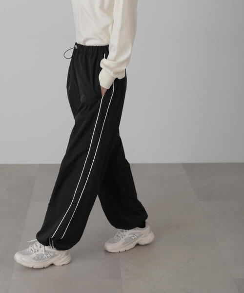 〔fabric&design〕 ワッシャー感のあるナイロン生地にパイピングの配色ラインを施したナイロンパンツ。 裾のドロストコードを調節してパラシュートシルエットにできます。 ウエストもドロスト仕様で調節可能。 ニット裏地付きで肌当たりが良く透けずらいので、オフでも透けを気にせず着用できます。 〔styling〕 程よいボリューム感のあるシルエットなのでコンパクトなトップスと合わせが高相性。 意匠感のあるぽこぽこジャガードキャミソールビスチェ(131-4110004)合わせでスポーツMIXスタイルも今年らしくておすすめです。 ■透け感:なし ■生地の厚さ:普通 ■裏地:あり ■伸縮性:なし ■光沢:なし ■シルエット:スタンダード --------------------------------------------------- ◆商品のお気に入り登録◆ お気に入りアイテムの値下げ・再入荷・在庫1点などの通知を受け取ることができます。 ◆ブランドのお気に入り登録◆ 新商品や再入荷、セール、クーポン配布などお得な情報を受け取ることができます。 --------------------------------------------------- ※ご注文いただいた予約商品のお届け時期の確認は、注文履歴ページより行えます。