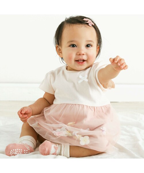 おねえちゃんサイズで秋冬に大人気だったチュールが可愛いアイテムが春夏用のベビー仕様にアップデート! お姫様みたいにふんわり広がるチュールスカートが女の子心をくすぐる1着になっています。 胸元やスカートにオンしたリボンがキュートなアクセントになっています。 チュールの中に入っているいろんな色のお花モチーフは周りと差がつくおしゃれなポイント◎ 動くたびにお花も一緒に動くから、みんなの視線が釘付けになっちゃうかも!? 春夏のお出かけが楽しくなっちゃうアイテムです。 お花の色が映えるホワイトと女の子らしいピンクの2色展開です。 同じデザインでおねえちゃんサイズのワンピース(1801-61513)も展開しているので姉妹・お友達とのお揃いコーデもおすすめです◎ ※固定されていないお花の色は一点一点異なります。 2024年春夏女の子アイテム。 【SLAP SLIP(スラップ スリップ)】 ~子どもの欲しいをカタチに~ ヨーロッパのこどものように 子どもらしい今しか着れないナチュラルなかわいさを提案 どこか上品で清楚感漂うフレンチカジュアルは いつものコーディネートをさりげなく格上げ