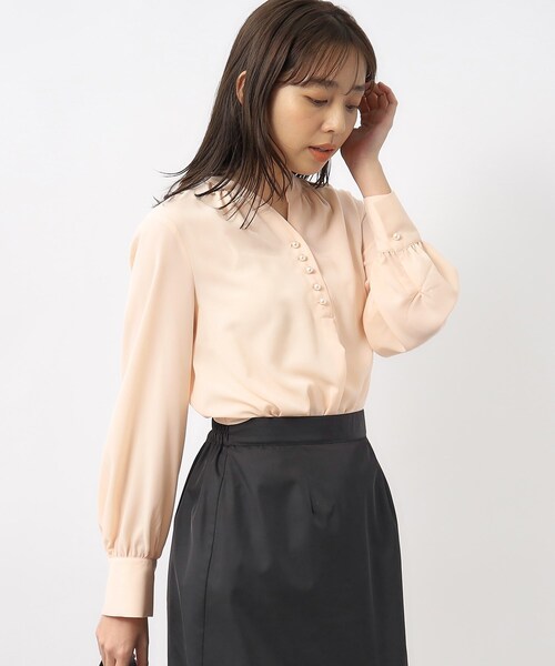 パール調スキッパーがポイントのジョーゼットブラウス 【素材】 ・index定番の落ち感のある柔らかいジョーゼット素材を使用 ・パール調の釦で上品な印象に仕上げています。 ・マシンウォッシャブルなので、ご自宅で簡単にお手入れしていただけます。 【デザイン】 ・すっきりとしたスキッパーデザインに、パール調の釦で華やぎを加えたデザインブラウスです。 ・スタンドネックのスキッパーで、首回りももたつかずすっきりとしています。 ・程良いボリューム感の袖で、袖口のカフスにもさりげないパール調の釦で華やぎを加えています。 モデル情報:身長166cm 着用サイズ:38(M) 店舗へのお問い合わせ商品番号:C58-88013 ●製品寸法: 34(XS):着丈60cm B98cm 袖丈55cm 肩幅36cm 36(S):着丈61cm B100cm 袖丈56cm 肩幅37cm 38(M):着丈62cm B102cm 袖丈57cm 肩幅38cm 40(L):着丈63cm B105cm 袖丈58cm 肩幅39cm 42(LL):着丈64cm B108cm 袖丈60cm 肩幅40cm 備考: