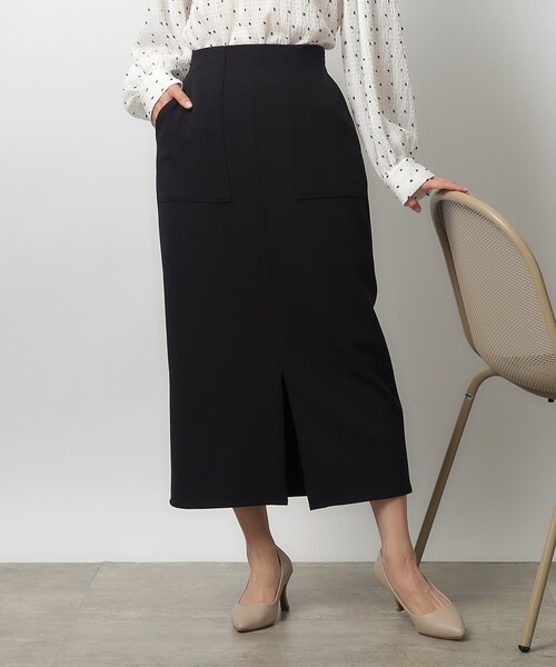 人気の美シルエットのタイトスカートから新素材で登場!!【デザイン】・すっきりとしたバランスで穿ける、Iラインのシンプルなタイトスカート・フロントやポケット部分に入ったステッチデザインがアクセントに。・細見えが叶うウエストデザインながら、バックはゴム仕様で楽に着て頂けます。・フロント裾スリットで、足さばきも快適です。※ポケット数:横×2※左脇ファスナー【素材】・ふくらみのある柔らかな二重織素材を使用。・程よい厚みとストレッチ性もあり、穿き心地も快適です。・きちんと感がありながら楽に着られる着心地の素材です。・マシンウォッシャブルでご自宅でのお洗濯も可能。※裏地ありモデル情報:身長165cm B72 W57 H84 着用サイズ:38(M)店舗へのお問い合わせ商品番号:637-78030●製品寸法:36(S):W64~66cm H84cm 総丈84cm38(M):W67~69cm H86cm 総丈85cm40(L):W70~72cm H89cm 総丈86cm42(LL):W74~76cm H92cm 総丈87cm備考: