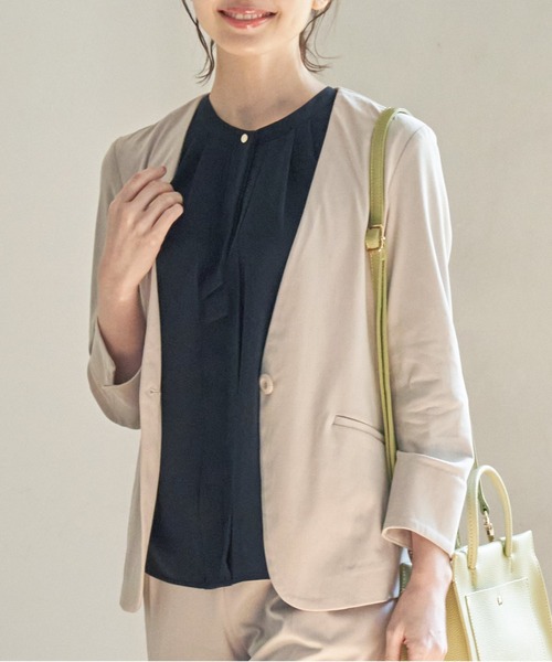 ノーカラー&Vネックですっきり着用できるジャケット。ストレッチ素材で着心地が良く、シワにもなりにくいためお手入れ簡単!同シリーズのパンツとセットアップで着用できます。【素材】伸縮性があり着心地のいい「GOKU楽カットソー」を使用。ツイル見えする表面感できちんとした印象です。【デザイン】汎用性のあるVネックのジャケットです。袖は7分袖となっているので、季節の変わり目にちょうどいい丈感です。【ikkaポイント】昨年人気だった Beasystrech シリーズで、季節の変わり目に気軽に羽織れるジャケットを作りました。カット素材のため締め付け感がなく、シワにもなりにくい&お洗濯可能でお手入れ簡単!羽織り感覚で着られるのにキチンと感もあるアイテムです。【おすすめコーディネート】同シリーズのパンツとセットアップで着用できます。・GOKU楽ストレッチパンツ 品番 51520012[クリーニング]洗濯機洗い可(非常に弱く)、ドライクリーニング可(F)、ウェットクリーニング(W)[洗濯方法]洗濯の際はネットを使用してください