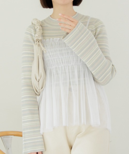 ■デザイン春のトレンドコーデが完成するチュールビスチェ♡透明感のあるチュール素材を二重仕様でほどよくボリュームを出してお作りした一枚です。胸元のシャーリングがデザインポイント♡ウエストの高めの位置から裾に向かってフレアに広がるデザインで、スタイルアップ効果も!肩ひもはアジャスターで調節可能♪デイリー使いだけでなく女子会やディズニーなど、特別なお出かけにもぴったりなアイテムです♡※着用・詳細画像はサンプルを使用しております。実際にお届けするサイズはサイズ欄をご確認ください。ribbon embroidery L/S、candy border knitとのレイヤードコーディネートがおすすめです。上からトップスを重ねる際は肩紐を長くして裾からチュールを覗かせて着るのが◎!デニムボトムスなど地厚なものと合わせると、よりビスチェの透明感が強調されてバランスよく着ていただけます。■flower/フラワー「love&joy」をコンセプトに、商品に愛を込め、お客様に楽しんでいただけるような、ナチュラルでガーリーなアイテムを提案していきます。【お買い物を上手にお楽しみいただくためのPOINT2つ】◎ 購入ボタン横の ♡ (ハートマーク)をクリック! 完売カラーの再入荷通知、残り1点の通知、セールの通知を受け取れます。 (クリックまたはタップで商品のお気に入り登録♪)◎ ショップのトップページにある ♡ (ハートマーク)「お気に入りショップに追加」をクリック! 新商品や再入荷等、いち早くブランドのお得な情報を受け取れます。 (ブランドのお気に入り登録♪)