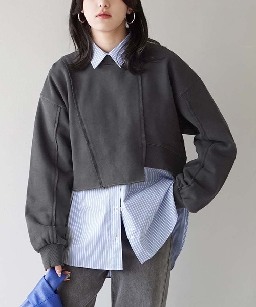 ダメージウェアで取り入れる大人の抜け感。 ダメージ加工とカットオフデザインを施したヴィンテージライクなショートスウェット。 肩を落としたドロップショルダーとボリューム袖が女性らしく見せ、ショート丈がすっきりとしたバランスの取れたシルエットに仕上げます。 首回りやお袖の程よいダメージがきれいめコーデの外しに使いやすく、こなれた大人カジュアルを演出。 洗濯:手洗い可 ※アイロンの際はあて布をご使用ください ※お洗濯の際はネットをご使用ください ▼この製品はピグメント加工を施してあります。着用やお洗濯を繰り返す事により白っぽくなることがあります。 ▼この製品は部分的にダメージ加工をしております。着用や洗濯の繰り返しにより裁断面のほつれが増加します。ほつれが気になる場合は無理に引っ張らず気になる箇所をはさみで取り除いてご着用くださいませ。 ▼ピリング(毛玉)が生じる場合があります。その際は無理に引っ張らずにハサミで取り除いてからご着用下さいませ。
