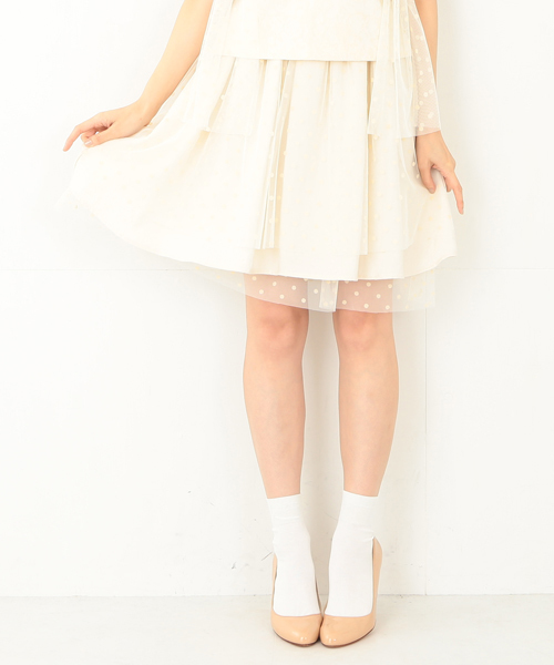 ドット&チュールの最強コンビスカートの登場です☆ ぽこぽことしたフロッキードットにふんわり広がるチュール。三層にも重ねたたっぷりのボリュームも。。女の子の大好きをぎゅっと詰め込みました♪ ウエストは光沢感をもたせてちょっぴり上品に。ブラウスを合わせて思いっきり甘く、Tシャツ+スニーカーで甘さを抑えたコーデも愛らしく決まる、おすすめのアイテムです。