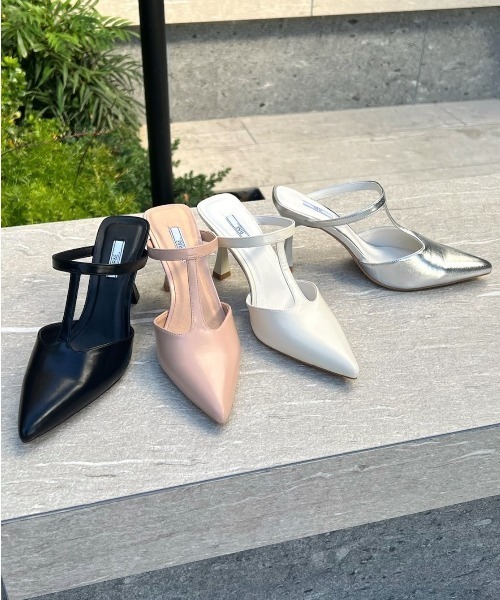 サクッと履けるミュールタイプのパンプスは春の必須アイテム☆Tストラップの抜型デザインで足元に軽さをもたらします。スクエア気味の踵に立体的なくびれたヒールがモード感をプラス!COOLなスポーツミックスタイルのコーデの仕上げにお勧め。