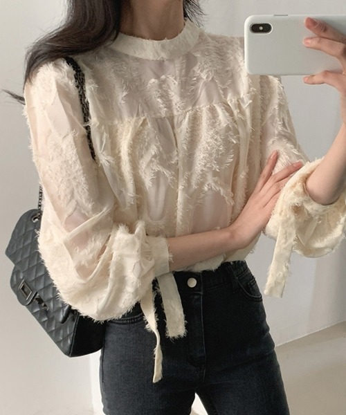 《カットジャガード素材を使用した華やかな7分袖ブラウス》 ■デザイン ・表情のあるカットジャガード生地を使用したブラウス。 ・毛足&シアー感があり着映えアイテムです! ・ふんわりしたフォルムと袖口のリボンが華やかな印象に。 ■素材 さらっとしたポリエステル素材 ■スタイリング 存在感のあるデザインで1枚でサマになるアイテムです。 デニムに合わせてカジュアルに、フレアスカートでフェミニンスタイルにも。 ------------------------------ 生地感:薄手 伸縮性:なし 透け感:あり 裏地:なし ------------------------------ ------------------------------ 【スタッフが着用しました!】 身長:153cm 普段着用サイズ:S~Mサイズ 今回着用サイズ:FREEサイズ ・着用感 ジャガード生地のふわっとした質感と、 表情のあるデザインが素敵なブラウス♪ 一枚あればオケージョンシーンから綺麗目コーデまで 幅広く着回しの利くアイテムですね◎ 胸元の切り替えギャザーや腕周りのリボンモチーフも大人カワイイです♪ ------------------------------------------------ 身長:164cm 普段着用サイズ:M~Lサイズ 今回着用サイズ:FREEサイズ ・着用感 一枚で様になってくれて、ボトムスを選ばないデザインが嬉しい♪ さらっとした着心地でシンプルなコーデと相性が抜群です◎ カジュアルに着こなすにはデニムにインして、フェミニンに着用するにはロングスカートなどと◎ 春~冬にかけて3シーズン着こなせる、一着あれぱ間違いなしのアイテムですね♪ ------------------------------------------------