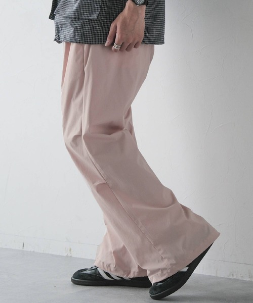 ーーー■ポイント・シャカシャカとした質感が特徴のラフなスタイルにぴったりなナイロンパンツ・膝に施したダーツがシルエットのアクセントに〇・ウエストはゴム/紐で調節可能なイージー仕様〇・裾のドローコードを絞ることでバルーンシルエットにも変形!・春らしいカラーからベーシックカラーまで様々なカラー展開■素材シャカシャカとした質感でラフに穿けるナイロン素材で仕上げました。イージーケア仕様なのも嬉しいポイントで長い期間でご利用いただけます〇======■参考サイズS:~165cmM:~175cmL:175cm~======ーーー■スタイリング今年らしいラフなカジュアルスタイルにぴったりなカラーナイロンパンツ!スウェットやパーカーとの相性が特に良く、シャツなどのあえてキレイ目のアイテムに合わせるスタイルもおすすめ!程よくボリュームのあるサイズ感でトップスのシルエットを選ばず様々なスタイリングに対応可能〇
