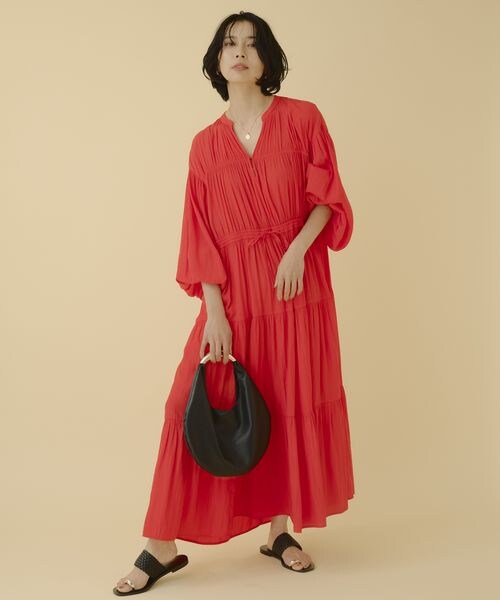 ーーー 触れたくなる揺れ感がレディな1枚で目を惹くワンピース 軽やかなポリエステルの生地をたっぷりと使用したワンピース。 歩いた時に軽やかに揺れる生地感が素敵です。 ウエスト部分のゴムを縛って弛ませて着るのもおすすめ。 ーーー 【スタイリング】 華やかなレッドのワンピースはフラットサンダルを合わせるとリゾートのような印象に。 ヒールを合わせたシティな着こなしもおすすめです。 【素材】 お手入れ方法:ハンドウォッシャブル ポリエステル100%の割繊糸を使用した生地は、柔らかで軽やか。綺麗な落ち感があり、ワンピースにぴったりな素材感。