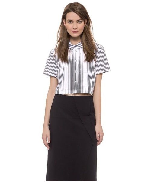A cropped Marc by Marc Jacobs button-down shirt with eye-catching stripes and a boxy fit. Patch front pocket and button placket. Short sleeves. Fabric: Shirting. 100% cotton. Dry clean. Imported, China. Measurements Length: 16.25in / 41cm, from shoulder Measurements from size S