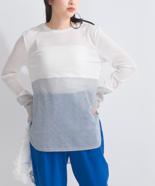 コーデにアクセントがプラスされる切替えカットソー本体は柔らかくソフトな肌触りのテレコ素材を使用。テロンとしたオチ感+伸縮性や毛玉になりにくいのが特徴です。切替えでラメ感たっぷりの異素材生地をドッキングしたデザインカットソーです。適度に透け感のあるシアー素材になっており、これからの季節に丁度いい爽やかな着心地の一枚です。長めの袖で指先がチラリと見える女性らしさがありながらも、袖口にはスリットが入っているので、スッキリとした印象になります。インナーとしてはもちろんですが、前後差のある裾やサイドスリット入りなので、メイントップスとしてもお洒落に着こなせます。重量: 約120g【詳細情報】厚み:■薄手 □ふつう □厚手透け感: □なし ■あり光沢感: □なし ■あり伸縮性: □なし ■あり裏地: ■なし □ありポケット:■なし □あり※撮影場所や明るさにより実際の商品と色味が若干異なる場合がございます。 ☆商品のお気に入り♡登録を押せば”再入荷通知”や”残りわずか通知” 値下げのお知らせが届きます!お気に入りのブランド登録していただければ新商品入荷のお知らせも届きますので是非登録してみて下さい