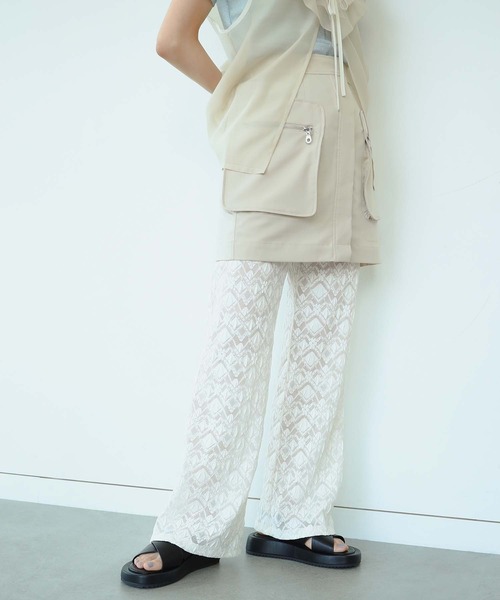 着こなしの幅が広がるアイテム■デザイン幾何学柄のカットソーレースを使用したパンツ。シルエットに拘り、ウエストに1周ゴムを入れ左脇ファスナーあきにしています。裏地はあえて短めにして、レースの透け感を楽しめる仕様に◎。1枚ではもちろん、レイヤードアイテムとしても活躍するひと品です。■コーディネート上にスカートやショートパンツを重ねたスタイルも◎おすすめ。■サイズ細身のフレアシルエット。体にフィットするサイズ感です。■素材ストレッチが効いたカットソー素材でらくちんな穿き心地です。■ケア方法ドライクリーニングのみ可 (詳細は商品についている品質表示ラベルをご覧ください)【OFF WHITE】BEAMS STAFF:H164 Size:1【BLACK】BEAMS STAFF:H160 Size:1※光の当たり具合やパソコンなどの閲覧環境によって、実際の色味と異なって見える場合がございます。予めご了承ください。※商品の色味は商品単体で撮影した画像をご参照ください。