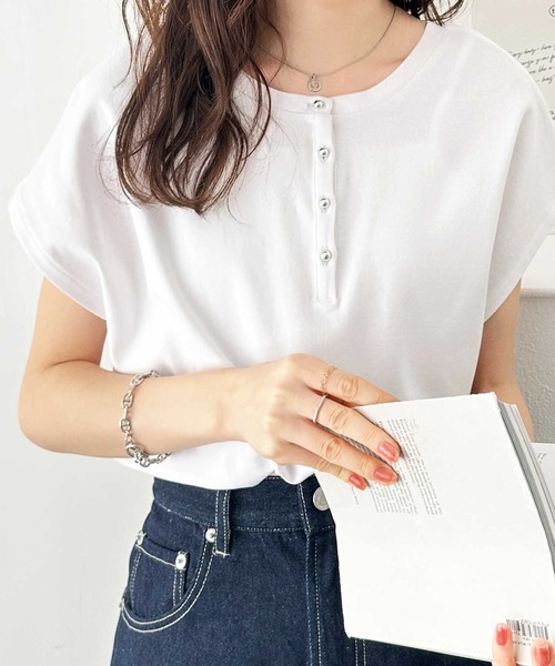 前後2wayで着回し力抜群♪ 綿100%ベーシック大人Tシャツ! 〇さらりとなめらかな肌触りのシルケット素材 〇ヘンリーネックとデザインボタンがアクセントに◎ 〇程よくゆとりのあるシルエットが華奢見せ ■デザイン シルケット加工を施したなめらかな肌触りの良い素材感で上品な印象に。 夏に大活躍のベーシックTシャツ。 ヘンリーネックとシルバーボタンがコーデのアクセントに。 絶妙な丈感のフレンチスリーブは気になる二の腕もさりげなくカバー◎ 程よい抜け感を演出する裾のサイドスリットもポイント。 前後2WAYで着用できるので、幅広い着こなしを楽しめます♪ ■素材 シルケット加工を施し、さらっとした表面感の上品スムース素材 心地よい柔らかな肌触りと伸縮性で着心地◎ 綿100%素材なのも嬉しいポイント♪ …………………… 透け感:なし 厚さ:普通 伸縮性:あり 裏地:なし 洗濯方法:洗濯機 …………………… ■コーディネート 絶妙な丈感でウエストイン・アウトどちらでも、着こなしを楽しめる優秀アイテム◎ ベーシックなオフ、ブラック、グレージュとボーダーの4色展開です。 定番のデニムコーデはもちろん、スラックスと合わせた オフィスカジュアルなスタイリングにもぴったり! スカートと合わせればお出かけコーデにも使えます。 毎日のコーデに重宝するベーシックな1枚です。 ●裾両脇スリットあり ●前後2WAY --------------------------------------------------------------------- ※サイズ寸法は実際の寸法と多少の誤差がある場合が ございます。 ※ご覧いただいているPC/WEB環境や撮影環境により、 多少色味が異なって見える場合がございます。 【お買い物をよりお楽しみいただく為に】 ▼商品のお気に入り登録をおすすめします♪ 『♡をクリック!』 完売カラーの再入荷やラスト1点の追加、 セールの際の通知を受ける事ができます。 ブランドのお気に入り登録もご一緒にお願い致します。 ---------------------------------------------------------------------