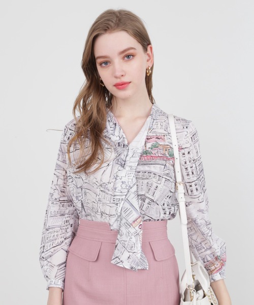 少し深めにあいたVカットがデコルテラインを美しく魅せ、スタンドからクロスされたボウデザインやタックドレープが女性らしいデザイン ヨーロッパの街並みを繊細に描いたプリントが優しい印象で、少し透け感のある素材がスタイリングを軽やかに仕上げてくれます。 【素材説明】 コットンのようなナチュラルなタッチでありながら上品な光沢としなやかさを併せ持ツィル素材を使用。ポリエステルなのでしわになりにくいのも特徴。プリントはヨーロッパの街並みの風景画を線画タッチで描いています。 【商品特性】 ストレッチなし/後ろスナップあき/袖口ボタン付き ◆お買い物をよりお楽しみいただくために◆ ・「商品のお気に入り登録」で完売カラーの再入荷やラスト1点、セール通知を受け取ることができます。 ・「ブランドのお気に入り登録」で新商品の入荷情報など、いち早く受け取ることができます。