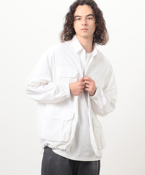 《デザイン》前身頃についた7つのポケットが特長的なシャツブルゾンです。フィッシングジャケットをタウンユースに落とし込んだアウトドアな雰囲気がありながらも上品な雰囲気に仕上げた逸品です。なんと言ってもポケットが7つ付いているのがデザインポイントです。また収納力も抜群。フラップ付きの大きめポケットはデザインのアクセントになるとともに、上からはもちろんサイドからも手が入れられてとても便利です。両脇裾につけているドローストリングを調節してブラウジングさせることでシルエットを変えてスタイリングをお楽しみいただけます。カラー展開は爽やかなホワイト、安定感のあるブラック、アクセントにおすすめのピンクです。ピンクはくすみカラーなのでコーディネートしやすく、ユニセックスで着ていただけます。《素材》ナイロンタッサーマットな表面感で、ややハリがありサラッとした手触りのナイロンタッサー素材です。タッサーとは、たて糸よりも太いよこ糸を使い、横方向にやや畝がでているのが特長の素材です。丈夫な素材なので、暖簾や旗などにもよく使われています。合繊素材でありながらも天然素材のようなナチュラルな質感が魅力です。裏地:無し伸縮性:無し光沢感:やや有り生地の厚み:普通レディースにもおすすめです。レディースモデル(H167 B82 W58 H85 着用サイズ:M)#SS新作#ブルゾン#テック#ユニセックス#ジェンダーレス※画像の商品はサンプルとなりますので実際の商品と仕様、加工、サイズが若干異なる場合がございます。※こちらの商品はFIVE FOXes独自の採寸方法となっています。本サイトのサイズガイドと採寸方法が異なる場合がありますのでご了承ください。