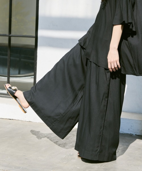 【レーヨンギャザーワイドパンツ】 滑らかで落ち感のあるレーヨン素材を使った着心地のよいリゾートウェア。 柔らかくサラリと肌に馴染む、Made in Indiaのレーヨン素材をオリジナルカラーに染めた生地を使っています。 リラックス感漂う、ゆったりとした着心地のリゾートウェアシリーズはブラウス・ワイドパンツ・ワンピースの3型展開。 ウエスト後ろ半分はゴム仕様、前はタックパンツ風のデザインになっており、履き心地が楽でキレイめにも見えるところが優秀ポイント。 内側に紐が通っているので、サイズ調整可能です◎ ブラウスとセットアップでの着用や、ワンピースと合わせたレイヤードスタイルもおすすめです。 ◇カラー詳細 ブラック・・・シックで上品な定番のブラック ブルー・・・深みのある鮮やかなロイヤルブルー ピンク・・・華やかさの中に落ち着きのあるダークピンク ------------------------ 透け感/なし(裏地付き) 光沢感/なし 伸縮性/なし 厚 み/普通 ポケット/左右両側に1つずつ 洗濯方法/ 家庭洗濯○ ------------------------ ※ご注意※ ・詳しいお手入れ方法は商品タグをご参照ください。 ・屋外の光や照明の当たり具合で、実際の商品の色味とカラー別画像の色味に若干の違いが発生する場合がございます。 ・詳細画像と併せてご確認の上、ご注文いただきますようお願いいたします。 ・撮影サンプルと量産分で生産ロットが違う場合風合いに多少のブレが生じることがございます。 manana suerte (マニャーナ スエルテ) "明日着るのが楽しみなお気に入りの服" 遊び心のある自由で開放的なムード 多様な色彩、テキスタイル 着る人の個性を引き立たせるデザインと、 着心地のよさを兼ね備えたアイテムを展開します。 manana suerte公式Instagram → @manana_suerte 【商品のお気に入り登録】 完売カラーの再入荷通知やラスト1点の通知 プライスダウンの通知も受け取ることができます。 【ブランドのお気に入り登録】 新商品や再入荷など、 ブランドの情報をいち早くお知らせいたします。 ぜひご登録ください◎