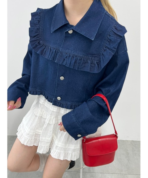 ヨーク襟のデザインでカジュアルになりがちなデニムジャケットを とびきりガーリーにアップデート スタイルアップ間違いなしのシルエットにこだわったアイテム。 ■datail&coordinate 肩と胸元の大きめフリルに裾のさりげないミニフリルがガーリーな雰囲気に。 華奢見えするゆったりシルエットで360°抜かりなく可愛く.. パンツやスカート、どんなボトムとも合わせやすいアイテムです。 【商品画像について】 ・画像はサンプルです。実際の商品と仕様、加工、サイズ、カラーが若干異なる場合がございます。 ・撮影場所や照明の照射・角度、お使いのモニター環境によりお色味が異なる場合がございます。予めご了承ください。 【取り扱い注意事項】 ・素材の特性上、水や汗で濡れたまま長時間放置することはお避け下さい。 ・濃色のアイテムは移染の恐れがあるため別洗いにしてください。 ・アテンションタグを必ずご確認の上、ご使用下さい。 ・生地の素材上、においが気になる場合がございます。その際は陰干しして頂くと、ほとんど感じられなくなります。 【サイズ表記について】 ・表記しているサイズは、すべてスタッフが採寸した実寸値になっております。 ・正確なサイズを測るよう心掛けておりますが、採寸用サンプルの実寸値となりますので、 お届けする商品と表記寸法の間に多少の誤差が生じる場合がございます。 ・商品により±2cm程度サイズに誤差がある場合がございますので、予めご了承ください。