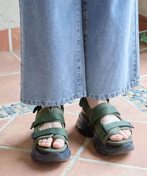 厚底のボリュームソールがポイントのサンダル。 甲部分とかかと部分をベルト仕様にし、足にフィットしやすいようデザインされた1足です。 程よい高さのソールは安定感もあり、脚長効果も〇 タウンユースからアウトドアまで幅広いシーンで活躍します。