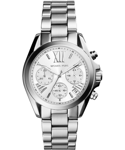 Michael Kors mini Bradshaw watch.Silvertone stainless steel.Case size: 36mm.Silvertone dial.Three hand movement.Three subdials; date window.Water-resistant to 5 ATM.Imported.