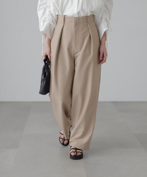 〔fabric〕フラットな目面のポリエステルレーヨン生地を使用。 デイリーはもちろん、通勤着などオフィスでの着用にも適しています。 〔design&styling〕 中心に向かってタックを折りたたんだ、太幅タックのデザインパンツ。 セミワイド型で、敢えて股下を少し長く設定しています。 スニーカーと合わせて裾を少しバウンドさせて着用するのがおススメです。 また、通勤着としてご着用の際は、ヒール合わせでちょうどよくなる長さです。 model:骨格ウェーブ --------------------------------------------------- ◆商品のお気に入り登録◆ お気に入りアイテムの値下げ・再入荷・在庫1点などの通知を受け取ることができます。 ◆ブランドのお気に入り登録◆ 新商品や再入荷、セール、クーポン配布などお得な情報を受け取ることができます。 --------------------------------------------------- ※ご注文いただいた予約商品のお届け時期の確認は、注文履歴ページより行えます。