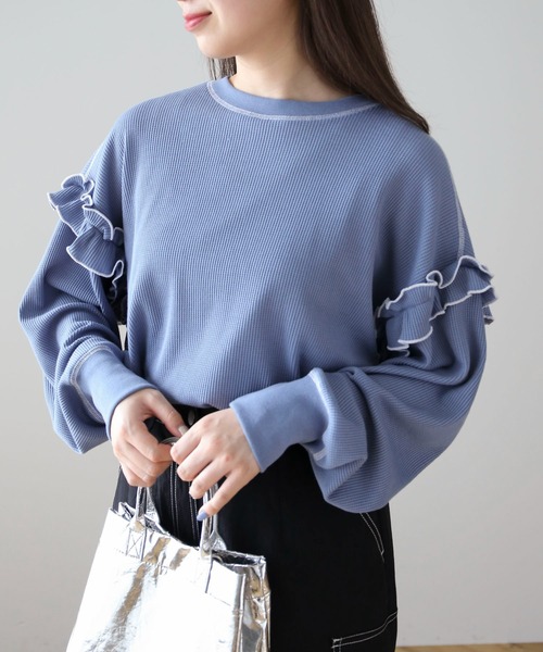 配色ステッチがアクセントをプラスするワッフルロングスリーブTシャツ。袖切替にフリルを施して愛らしい印象をプラス。凹凸感のある素材で肌離れも良く、さらりと軽やかに着用することができます。コーディネートに取り入れるだけでも、大人可愛いスタイリングが楽しめるアイテムです。透け感[無し]オフホワイト/杢グレーややあり 裏地[無し] 伸縮性[有り] 光沢感[無し] 生地の厚さ[普通] 付属品[無し] ポケット[無し]●製品寸法:F:バスト65.5cm 着丈58.5cm 袖丈55cm 肩幅60cm 裾幅60.5cm備考: