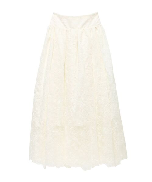 ■Detail ハイウエストシルエットの、映えスカートです。ハイウエストなので、脚長効果があり、スタイリングのバランスもよくなるで山です。コットン素材に花柄が刺繍されたかわいい素材感に、裾がスカラップになっています。歩くとボリューミーなシルエットがかわいいスカートです。ウエストは、バックスタイルにゴムとファスナー仕様。 ■Fabric コットンに花柄の刺繍を入れた軽い素材。 ■Size Free size ■Coordinate シンプルながらに主役級のデザインなので、トップスはカジュアルでも合わせやすいです。ガーリーアイテムも喧嘩しすぎない無地スカートなので、合わせやすいスカートです。 ■Styling item SHEER GATHER BLOUSON MESSAGE LOGO TEE TULLE RUFFLE 2WAY PO 2WAY GATHER BL