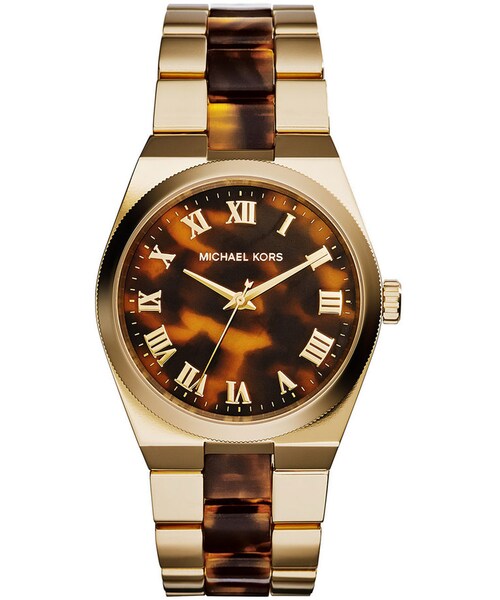 Michael Kors Channing watch.Golden stainless steel.Tortoise-print acetate center links.Case size: 38mm.Tortoise-print dial.Roman numeral markers.Three hand movement.Water-resistant to 10 ATM.Imported.