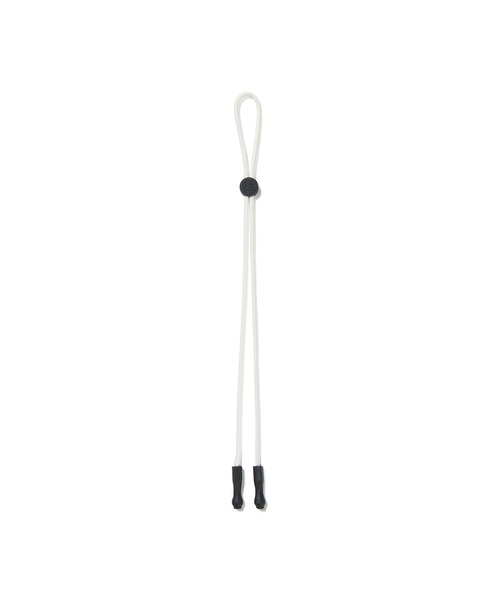 表情豊かな織り柄と耐久性・強度に優れたパラシュートコードを使用したグラスコード。先端にあしらわれたパーツにアイウェアの先セルを挿し込む仕様。サークルロゴを象ったシリコンパッチは、好みのフィット感に調節できる便利なアジャスターとしてだけでなく、ワンポイントの役割も担います。ブラック、カーキ、ベージュ、ホワイトの4色展開。