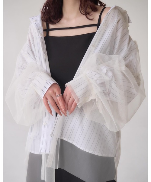 ストライプシャツとチュールシャツがセットになったアイテム。 合わせて着るとストライプシャツの上に同色のチュールが重なり、目を惹く1枚に。 それぞれでも着用可能なため、着回しバリエーション多数✨ キャミや、ワンピースの上にさらっと羽織ったり、トップスとしても着るのも◎ パフスリーブやゆったりとしたシルエットにもこだわりました。 ストライプシャツの柄は、細めでよく見ると小さなドット模様が連なったデザインになっており、 ストライプでもカジュアルすぎない印象です♡ また、チュールは柔らかい生地で1枚でも着心地よく、ふわっとした風合いが出ます。 【ご着用方法】 (画像欄の最後のお写真がパターンごとの状態になっております。) パターン1(お届け時):ストライプシャツのボタンを通常通り留めます。チュールシャツは、裏返しになった状態が本商品では表側になりますため、ボタンが裏に向いた状態で留め合わせ、ストライプシャツの上に重ね着します。 パターン2(トップススタイル):パターン1の状態から第二ボタンより下はそのままに、上のボタン2つを外し、ストライプシャツ・チュールシャツそれぞれの右襟側同士、左襟側同士を留め合わせます。チュールシャツの襟は、ストライプシャツの襟の下に入れると綺麗に収まります。 パターン3(羽織スタイル):パターン2の状態から、上2つのボタン同様に第二ボタンから下も、左右重なり合うボタンを留め合わせます。1枚のシャツの形で羽織っていただけるおすすめの着方です。 パターン4(ストライプシャツ単体):そのまま着るだけでもきまる1枚。カジュアルすぎない雰囲気に。 パターン5(チュールシャツ単体):チュールシャツは、裏返しになった状態が本商品では表側になりますが、反対側(通常のボタンの向き)でもご着用可能です。 お使いの端末やモニターによってお届けの商品との見え方に多少の差が生じる可能性がございます。予めご了承ください。 ご購入前のご相談は Instagramにてお問い合わせいただけますと幸いです。
