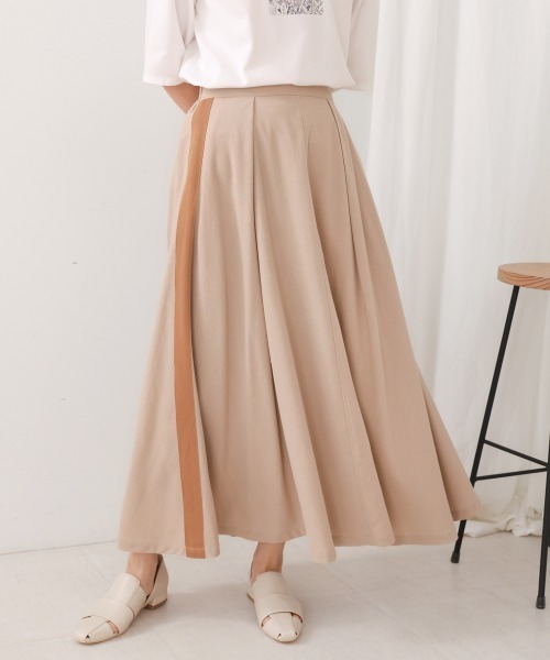 ■POINT 春夏らしい綿麻素材を使用した、ソフトワークスカート。ワーク感のある素材を使用しつつ、フロントのタックでスッキリしたウエストにし、すとんと落ちるほどよいAラインで大人の女性らしい雰囲気。サイドには配色テープを施してさりげないワンポイントに。縦にラインがはいることでアイラインを協調してすらっと長いシルエットに。 ■FABRIC 綿とリネンで夏らしいシャリっとしたタッチ。ポリエステルもはいっているので、通常の綿麻素材に比べて落ち感があり、シワがとれやすい。 ■COORDINATE さりげないポイントがはいっているボトムなので、シンプルなトップスで◎スッキリとしたシルエットなので、ボリュームがあるトップスでも好相性です。 ………………… 透け感:なし 裏地:あり ………………… ★商品のお気に入り登録 登録すると、完売しても再入荷時に通知を受け取ることができます。 ほかにもお得な特典があるかもしれません♪ ★ブランドのお気に入り登録 新商品や再入荷などの情報を受け取ることができますので、是非ご登録ください♪