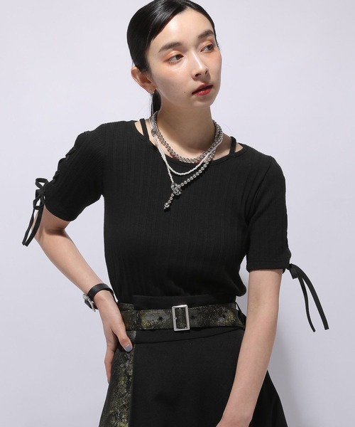 ーーー レースアップデザインがポイントの 一枚でも映えるリブカットソー ーーー point □紐を緩めに結べば肌見せができる袖レースアップデザイン □インナーでも使いやすい長すぎない袖丈の設定で二の腕を見せずに着用できる □凹凸感のあるランダムリブを使用し、伸縮性がある生地の為、ストレスフリーで程よくフィット感あり styling シャツやジャケットのインナーとしても◎ 夏は一枚で、カジュアルに着たい方はデニムやキャミワンピ合わせ、 綺麗めに着たい方はフレアスカートなどの合わせがおすすめです。 ※撮影環境により、光の当たり具合で 色味が違って見える場合があります。 あらかじめご了承下さい。