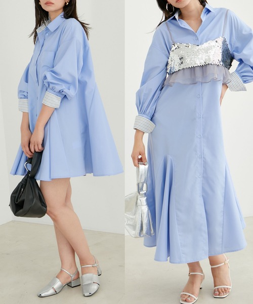 大人気シリーズ★フレア切り替えシャツワンピース◆2024春夏◆ 【デザイン・シルエット】 ミニ丈と、ロングの着丈が選べる、フレアーシルエットのワンピース。 <POINT> ・スタンドカラーからシャツ襟にデザインアップデート。 ・カフスと襟ぐり、胸ポケット裏にストライプの裏地。(表地の柄によって変更しています) ・ミニ丈とロング丈の選べる着丈。 ・裾に楕円形のフレア切り替えを入れて歩くたびに揺れてかわいいです。 【素材】 程よくハリ感のある綿タッチポリエステル。シワが取れやすく、気軽に洗濯機洗いができるのも嬉しいポイントです。 【カラー】 ・モノトーンストライプは、ミニ丈のみ。 ・サックスブルーは、ミニ丈とロング丈。 ・イエローベージュストライプは、ロング丈のみ。 【おすすめのスタイリング】 シャツワンピースのかっちり感にきらっとしたアイテムを合わせるのが今年のトレンドキラキラのビスチェとのスタイリングが一押しです! もちろん一枚でシンプルに着ていただくのも◎ 春アウターを羽織る際も、ショート、ロングどちらとの相性も抜群です。 ----------------------------- 裏地:なし 光沢感:なし 透け感:なし(白はややあり) 伸縮性:なし ポケット:胸ポケットにあり ボタン:あり(開閉可) 生地の厚さ:普通 季節:通年 ----------------------------- 【モデル着用サイズ】 全色モデル身長:160cm、着用サイズ:F ※画像の商品はサンプルです。 実際の商品と仕様、加工、サイズが若干異なる場合がございます。 ※画像によっては実際の色味と異なる場合があります。正しい色味は生地アップ画像をご確認ください。